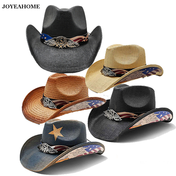 Cappello da Cowboy di paglia da uomo occidentale cappello da Cowboy di paglia da donna con bandiera americana nera
