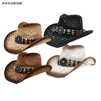 Cappello da Cowboy occidentale etnico Hollowenn tessuto a mano cappello da Cowboy grande per la grondaia cappello Jazz per la spiaggia all'aperto protezione solare cappello di paglia